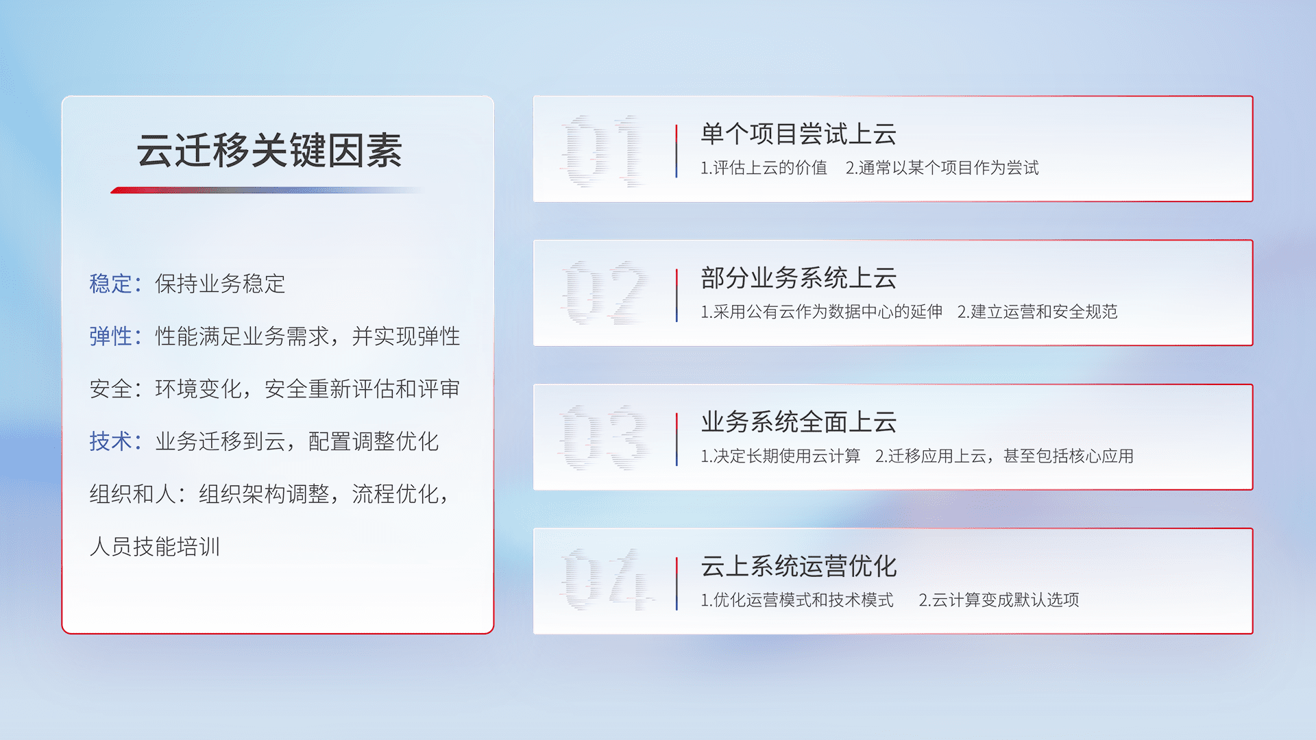 结合实际业务,,从规划设计、、、、云平台选型、、、云原生改造、、、、数据迁移、、、集成交付,,迁移全过程为客户识别最佳上云路径,,,做好风险识别管理,,,,设计网络架构、、、身份权限、、安全审计合规、、、、操作审计、、、、日志审计、、、、监控告警策略、、多站点容灾设计等,,对云上基础设施进行整体规划,,,提升IT治理水平,,以满足弹性、、、、高可用、、高性能的需求。。