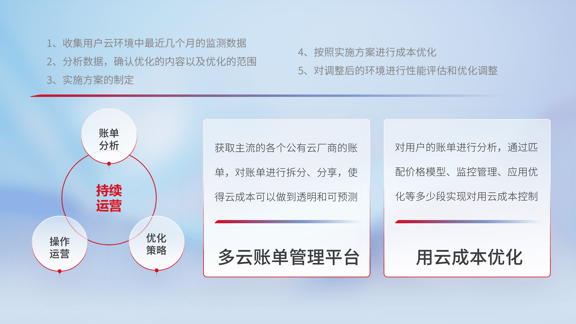 通过多云纳管,,以统一的资源数据模型把客户的云资源进行抽象和封装,,,,进而实现对多云资源的统一操作,,保障云资源管理的可靠性、、稳定性与可用性。。量身定制化运维内容,,,,配置、、、开发运维、、、补丁管理、、、备份、、、监控、、、、认证和访问管理、、、审计和日常巡检等,,保障在用云过程中的可靠度,,,,稳定度以及高可用率。。。。