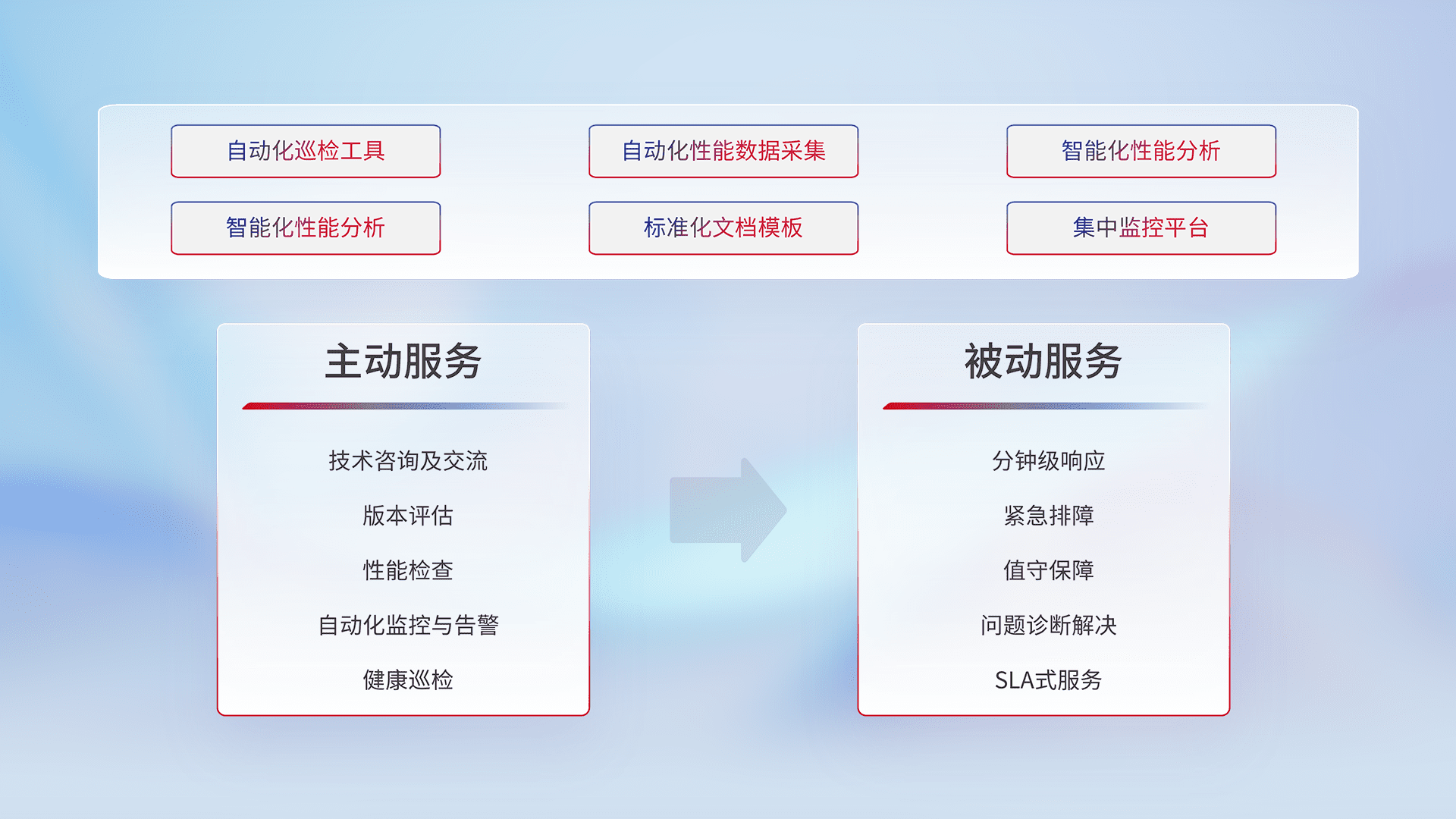 智能化工具和标准化文档,,,保障服务质量,,,,提供主动服务(包含技术咨询、、、版本评估、、、、性能检查、、、自动化监控与告警、、、健康巡检)和被动服务包含(分钟级响应、、、、紧急排障、、、值守保障、、、、问题诊断解决、、、SLA服务)。。